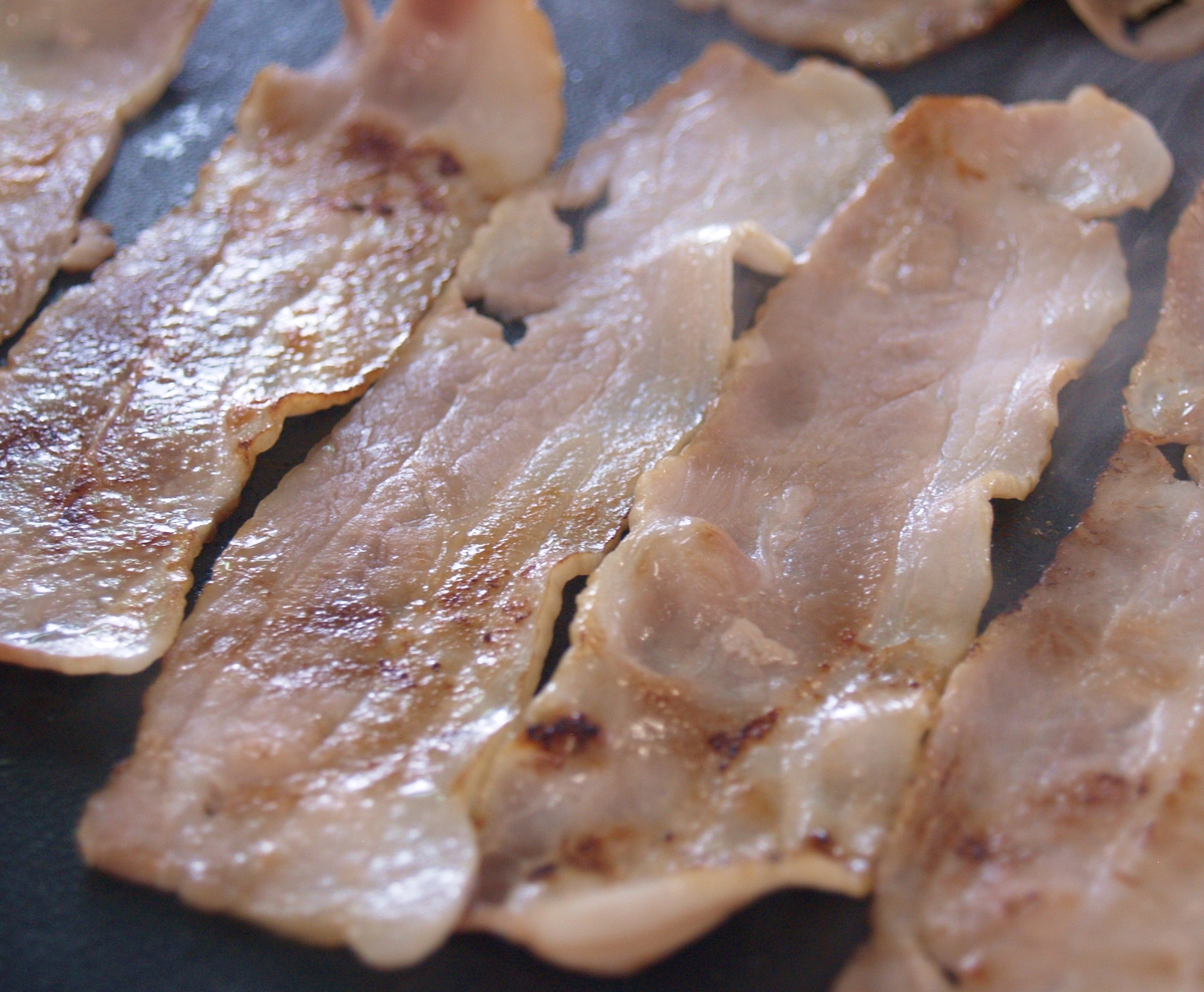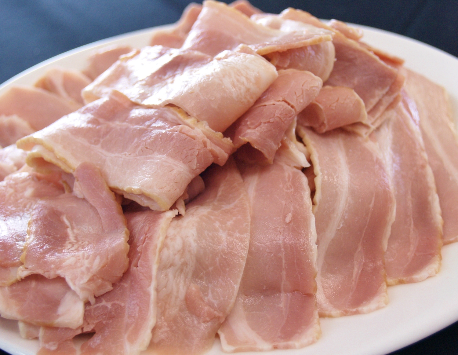 肉を塩漬けする工程で、発色材や着色料を使わずに製造した「無塩せき」のベーコンです。